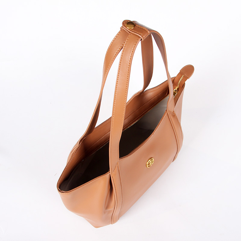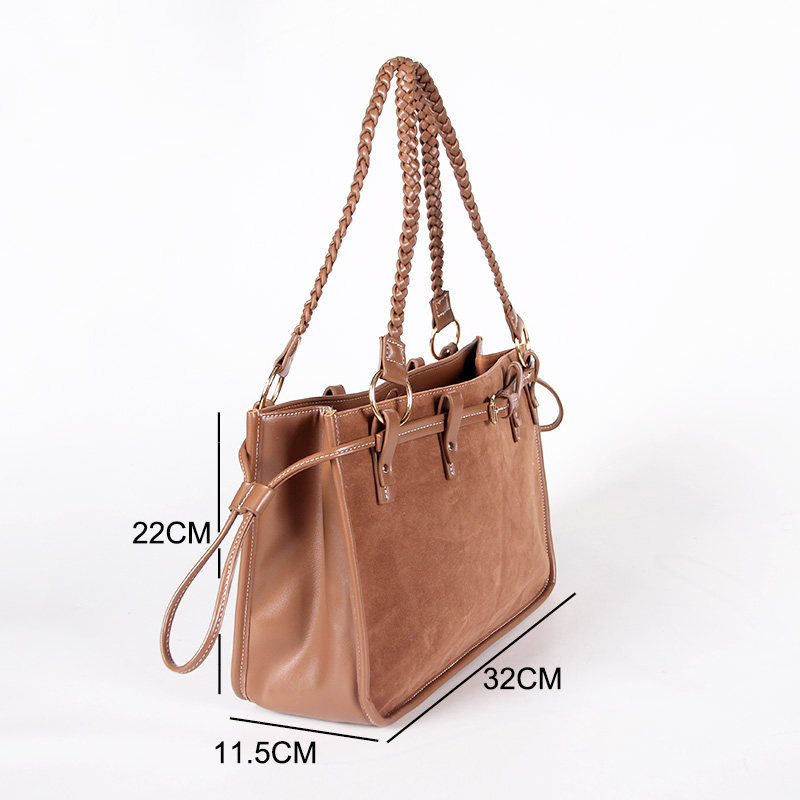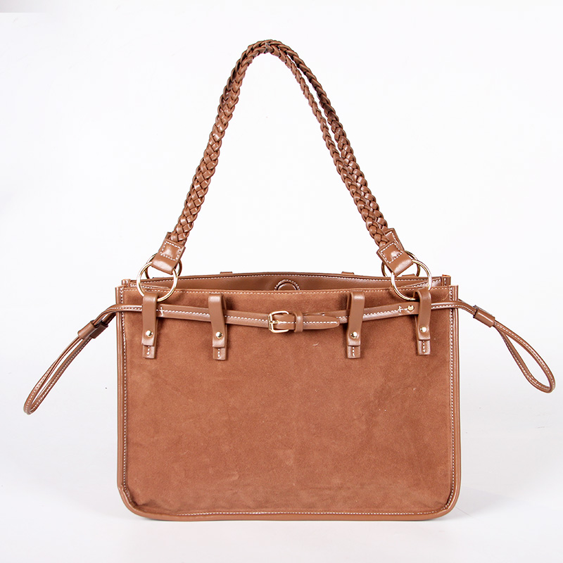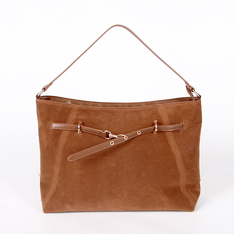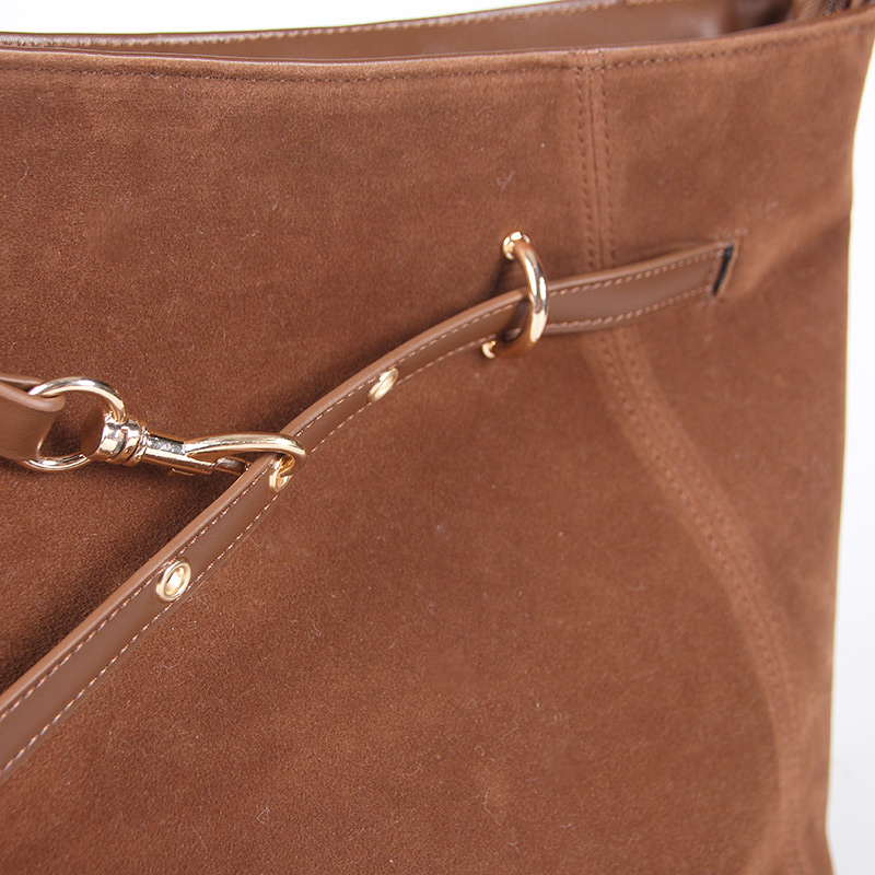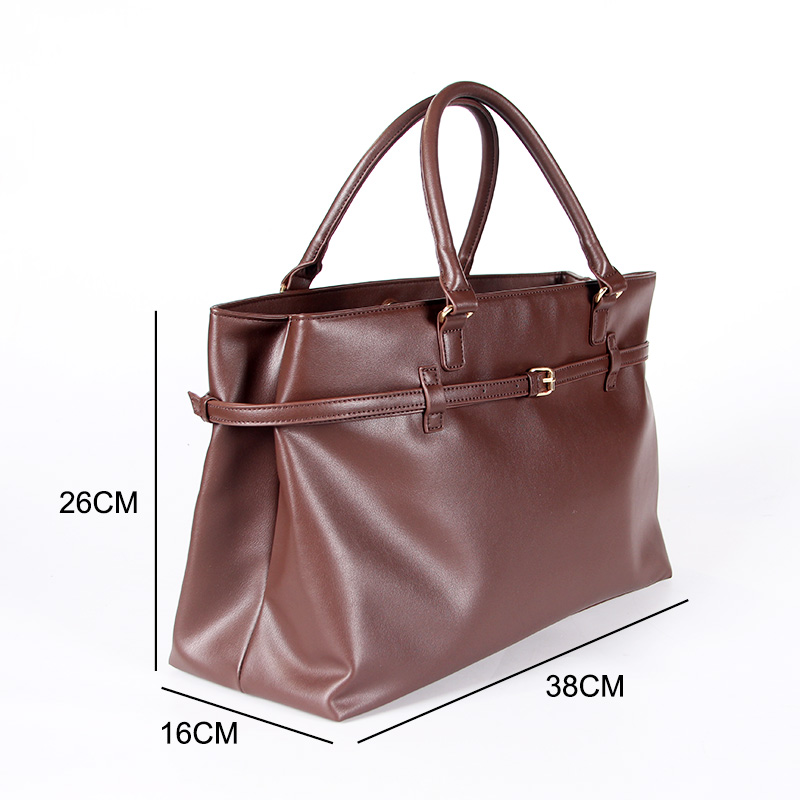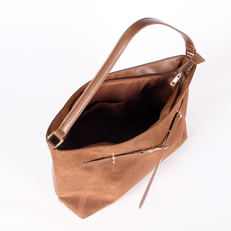 Tote bag with two handles. Model with magnetic button closure at the top. One belt strap with metal buckle for decoration. One zipper pocket inside.