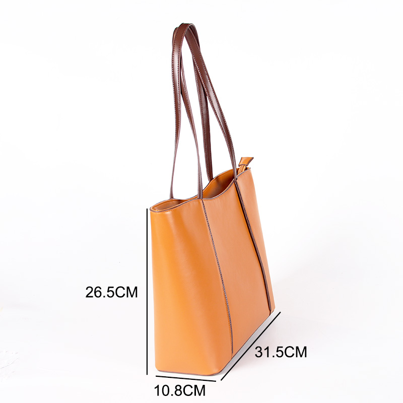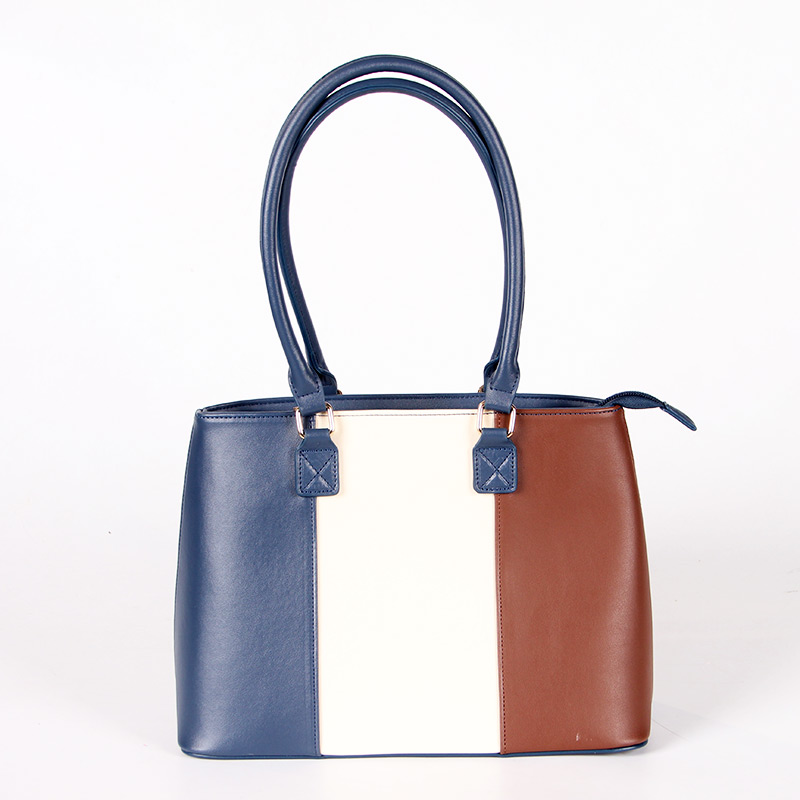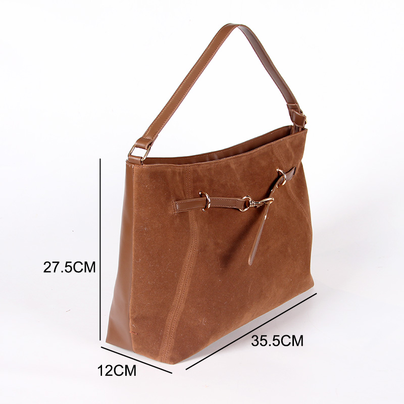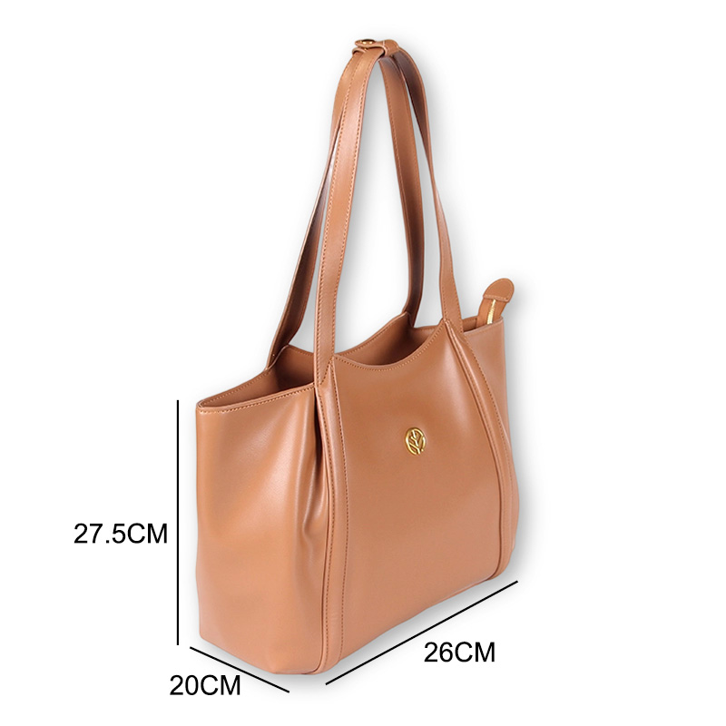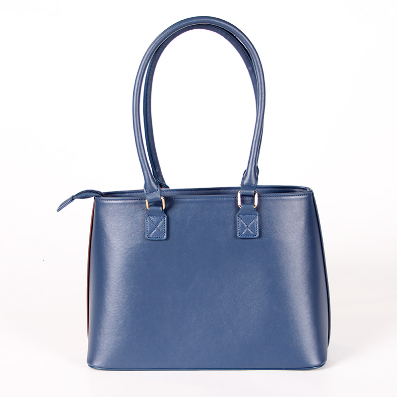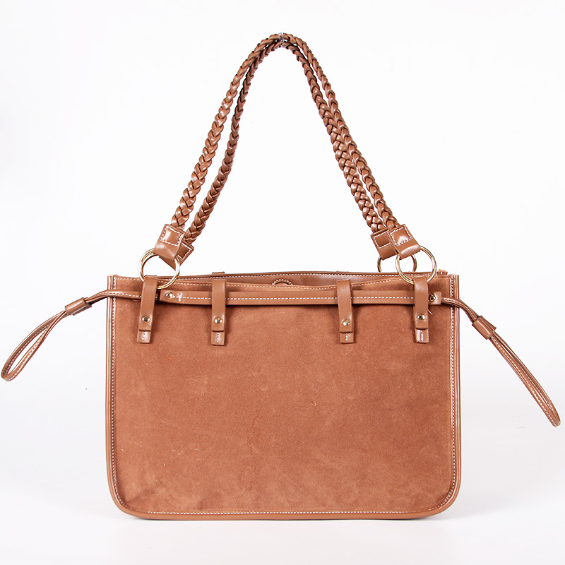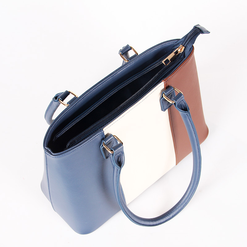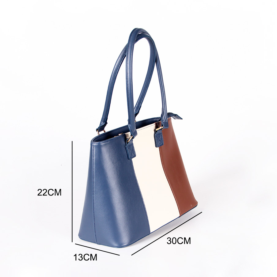 Tote bag with two handles. Model with magnetic button closure at the top. One belt strap with metal buckle for decoration. One zipper pocket inside.
